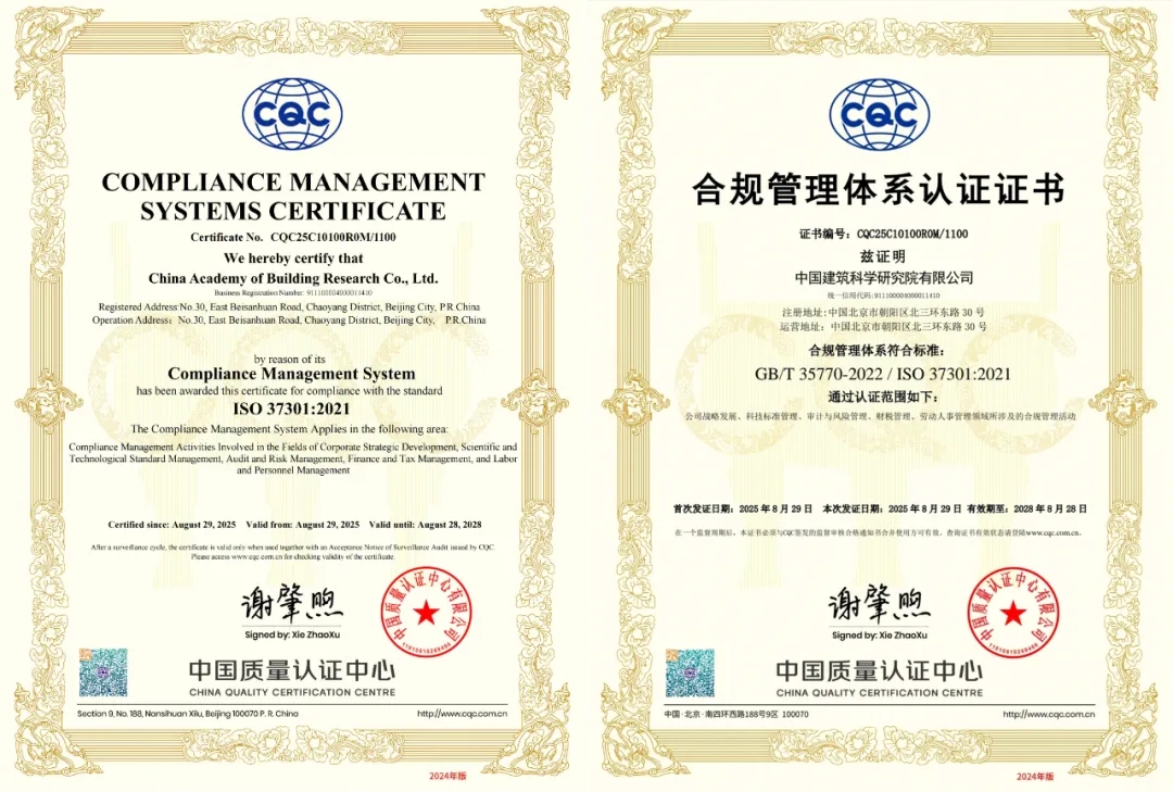 近日,中國(guó)建研院成功通過(guò)中國(guó)質(zhì)量認(rèn)證中心(CQC)合規(guī)管理體系審核,獲得國(guó)際標(biāo)準(zhǔn)ISO37301:2021和國(guó)家標(biāo)準(zhǔn)GB/T35770-2022認(rèn)證證書(shū),標(biāo)志著公司在合規(guī)治理現(xiàn)代化進(jìn)程中邁出堅(jiān)實(shí)一步。